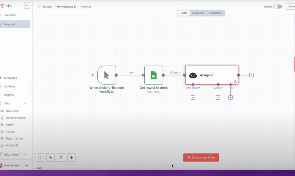 Go to the n8n dashboard and look for the ‘Create Workflow’ button. Make sure you have added your credentials first.