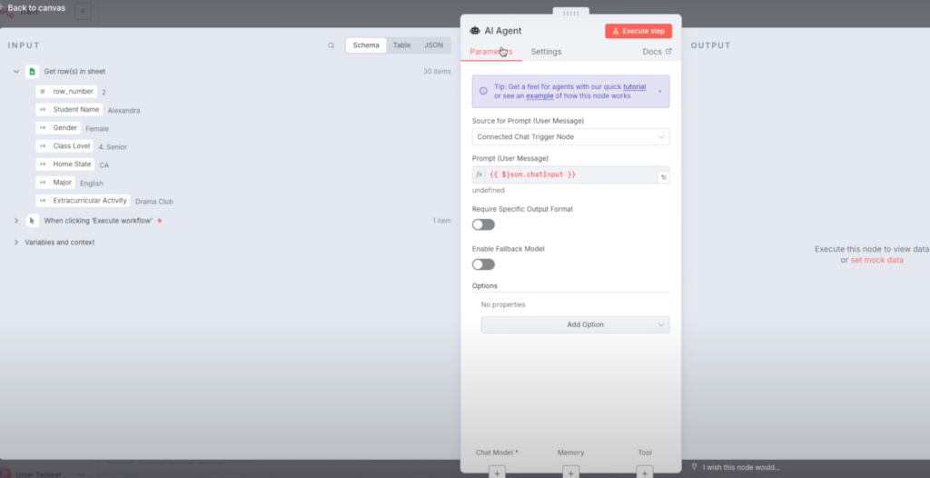 I am using the AI Agent node here. This node is used to filter data. You can also add your own code here if needed. Click on the ‘+’ icon and search for the ‘AI Agent’ node.